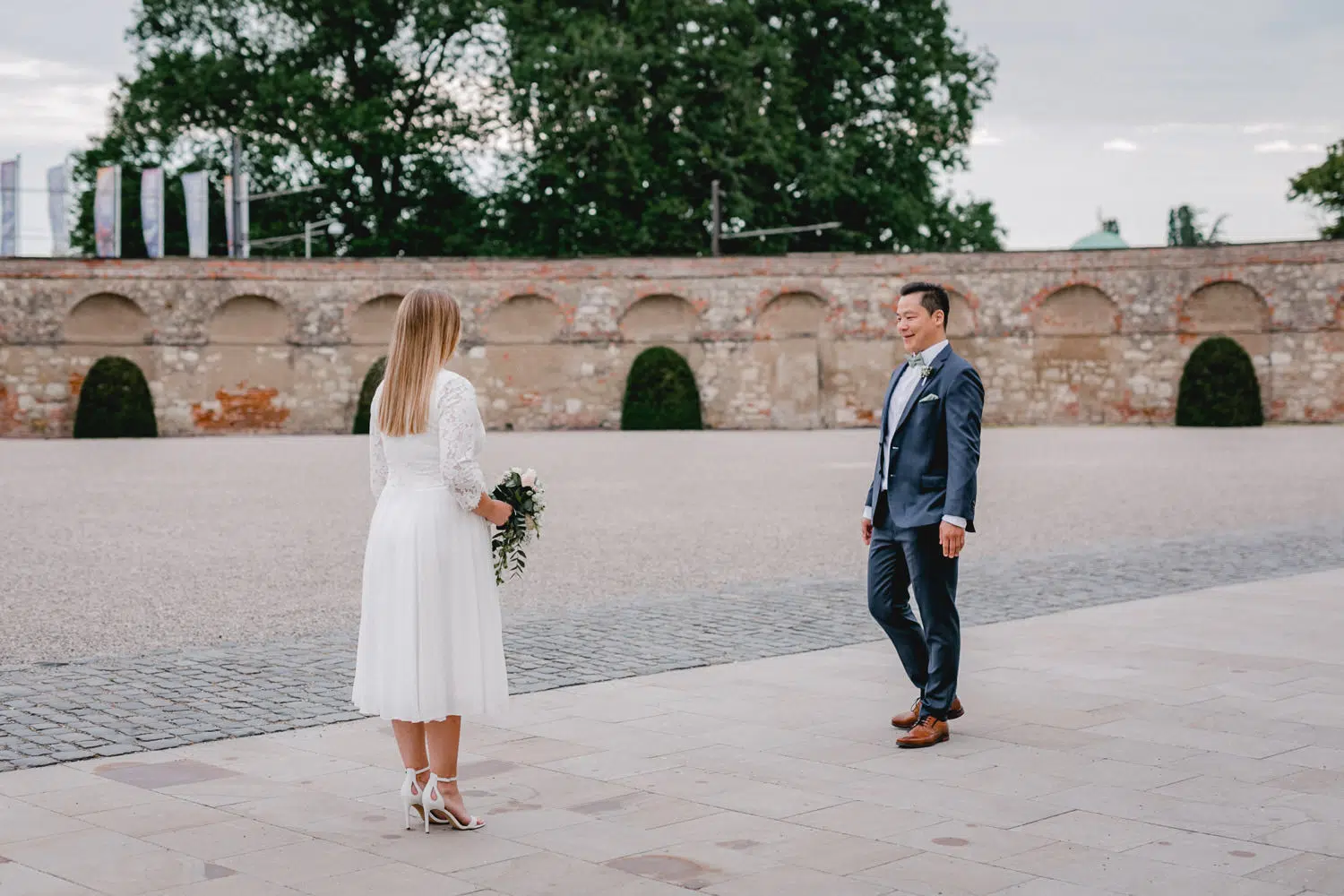 Er steht mir gewandt mit dem Gesicht und von hinten kommt die Braut dazu.